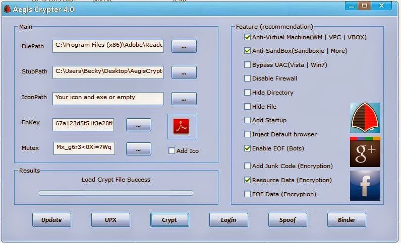 This FUD Crypter provides great flexibility for customizing your final crypted build. You can provide your own encryption key (EnKey) and Mutex. There is inbuilt icon changer for changing exe icon, alternatively you can use reshacker or any other icon changer for advance icon properties.